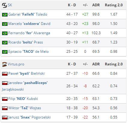 比赛率先在VP选择的Train上进行,SK作为CT方赢下第一个手枪局后被VP完成一次强起翻盘,VP随后连得4分,取得5-1的良好开局。但所有人都不会想到,VP在得到第5分之后没有再度取分,凭借FalleN的出色发挥,SK打出一波9-0的完美防守,下半场更是没有给VP任何机会,在1-5落后的情况下连得15分,以16-5先下一城。