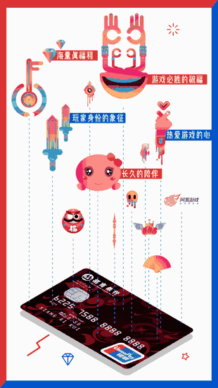 作为一张面向全体网易游戏玩家的信用卡,这张卡的卡面设计也是以网易游戏元素为主,不论你玩哪一款网易游戏,都可以毫无违和感地拥有这张卡。有了它,玩家可以在日常生活中以卡会友。说不定哪一次刷卡消费的时候,这张玩家信物便会让你遇到另一位游戏热爱者,开启一段奇遇呢?