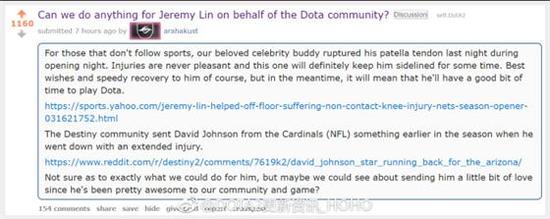 林书豪在NBA比赛中不幸受伤,之后将会有很长的一段康复期。国外#DOTA2#Reddit论坛刀友arahakust呼吁大家为林书豪做点什么表示慰问和鼓励,因为林书豪一直以来非常支持DOTA2社区。
