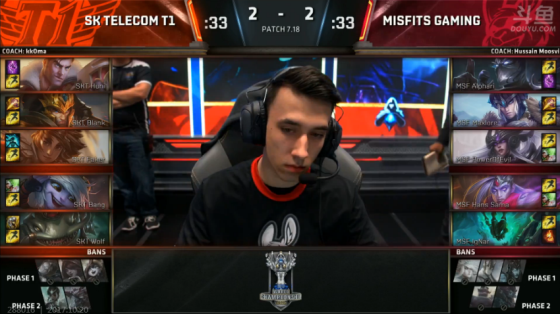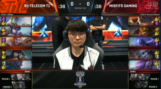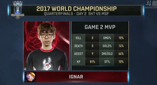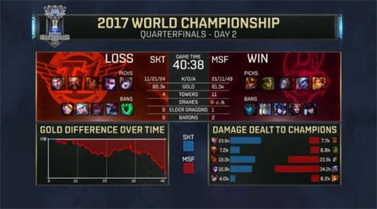 19分钟SKT分带上了高地,MSF面对SKT的杰斯单带毫无办法,SKT轻松把经济领先到了10000,随后SKT野区赢了一波团战后拿下大龙轻松地拿下了比赛。