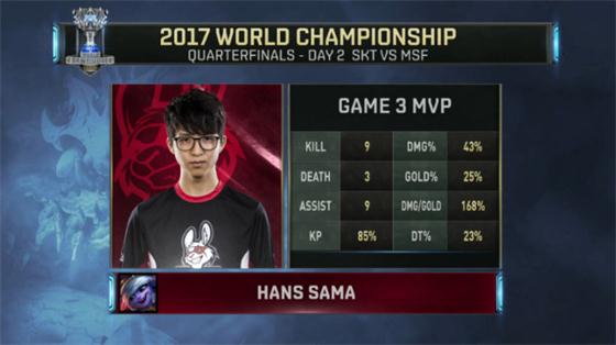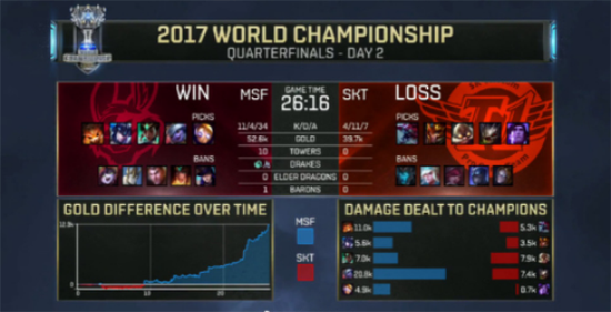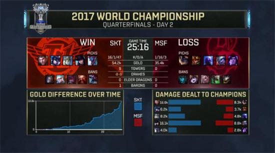 10月20日,S7英雄联盟世界赛八强赛的第二战卫冕冠军SKT对战MSF战队。首局SKT轻松拿下MSF,本以为会是一场轻松BO5,但是MSF连续两局拿出黑科技先拿到赛点,但是最终SKT还是凭借超强的团战能力击败了MSF。