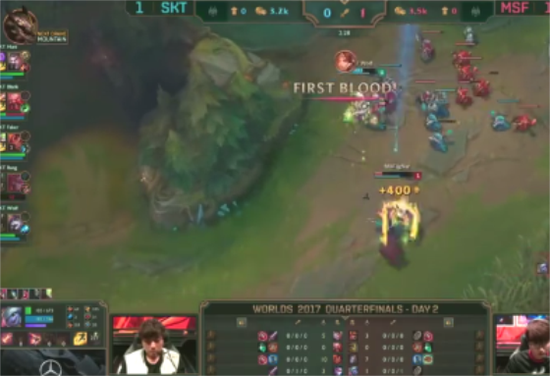 比赛前期SKT上野直接入侵野区利用前期对战能力上的优势直接拿到了对方上单慎的一血。随后拿到一血的杰斯滚起了雪球直接拿到了上了一塔。中期,MSF打出了自己的节奏,尽管上路有点崩,但是他们还是利用慎的支援在中路拿到了SKT两个人头把经济追了回来。