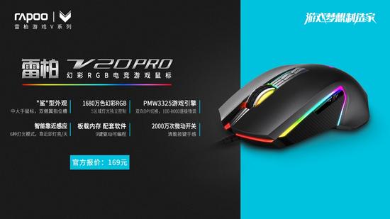 老牌实力大厂,国产外设领军品牌——雷柏(RAPOO)旗下游戏V系列今日正式推出V20PRO幻彩RGB电竞游戏鼠标。唯美弧线,幻彩流光,搭载PMW3325的专业光学游戏引擎, 支持100-8000DPI双向调节、逐级微调,9键可自定义编程,约1680万色幻彩灯光系统,5区域灯光组独立控制,智能靠近感应黑科技的加持,全新出击。暗影深空灰的外壳点缀以金属装饰条,质感不凡。雷柏V20PRO幻彩RGB电竞游戏鼠标现已全面上市,售价169元。