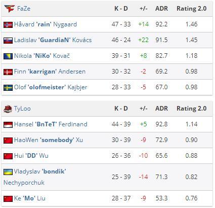 FaZe在个人能力方面更胜一筹下半场手枪局TYLOO取得优势,但是他们在埋下C4并且2打1的情况下被karrigan强行拆包成功,这极大打击了TYLOO的气势。好在TYLOO及时调整了心态,选择一局ECO赢下了下半场第一个长枪局,随后又通过一次夹攻B区将FaZe打入ECO,TYLOO连得4分。遗憾的是再次进入长枪局后FaZe还是依靠超强的选手个人能力连下两分取得7个赛点,TYLOO挽救了一个赛点之后仍以9-16不敌对手。