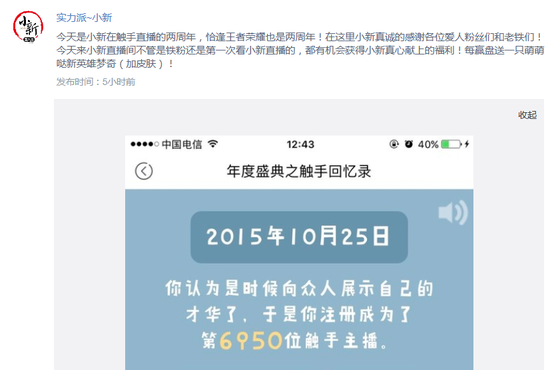 小新在动态中表示:触手直播玩了两年了!一路走来最感谢的就是能有这么多的粉丝支持!还记得一开始做直播只是想自己待在家里打游戏也是打,不如开个直播这样还能交点朋友。直到自己做了一段时间后才发现自己真的爱上了直播,也拥有了很多朋友,一路走来能有这么多粉丝我付出了很多也成长了很多。