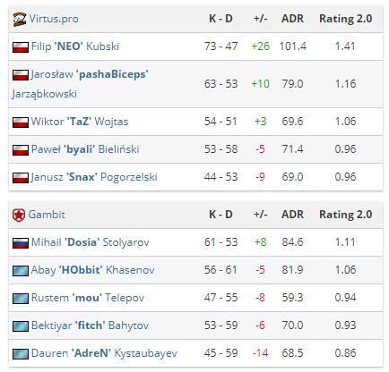 易边之后又一次丢掉手枪局的Gambit渐渐经济崩盘,仅靠Dosia的三杀拿下一分,而另一边的VP凭借老将TAZ的复苏发挥疯狂扩大分差,最终经验老道的byali赢下1V3残局,VP也以16:6的大比分拿下了第一张地图的胜利。