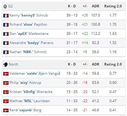 双方率先在Mirage上展开争夺,North先做T赢下手枪局,但谁也没有想到,这一分竟是North在这张地图上拿到的唯一一分,G2从第二局开始完成了令人不可思议的16-0的高潮,以这样一个让人惊叹的方式获得了胜利。