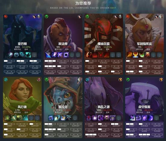 这个页面来自《Dota2》第三方数据网站dotabuff,页面面向那些想要学习《Dota2》的《LOL》玩家,首先就是从MOBA游戏的核心内容,英雄入手,两款游戏都有数量众多的可选英雄,dotabuff这个页面让你选择最喜欢的或者常玩的6个英雄,然后给《Dota2》新手推荐出相似的英雄。