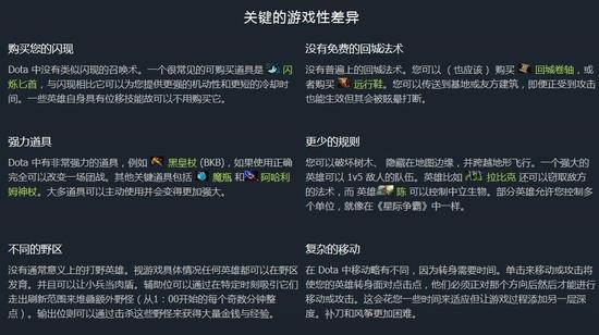 而后页面上还讲述了一些两款游戏的差异内容,比如闪现、TP、野区、信使和关键道具等等。当然单靠这些信息并不足以让你完全熟悉《Dota2》,多多练习才是根本。