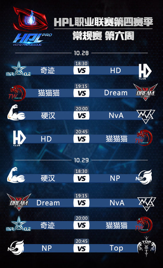10月28日-10月29日,由英雄互娱主办,VSPN承办,HPL首席合作伙伴夏普赞助支持的HPL职业联赛第四赛季迎来第六周赛程。本周,联盟最强的两支战队:猫猫猫与HD将再次相遇,一争高下。