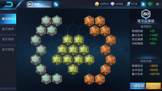 铭文:5级冥想+5级虚空+5级宿命,最后的效果是物理防御+33,最大生命+1462,攻击速度+10%,冷却+6%,标准的肉盾铭文。
