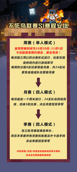 不死鸟联赛League of Phoenix(以下简称LOP联赛)是由CC直播和花雨庭服务器联合主办的专业赛事,代表了我的世界《代号:吃鸡》玩法的最高竞技水平。赛事将在“花雨庭”服务器中作为常规模式开放,面向所有“吃鸡”爱好者,玩家们通过周赛/月赛/季赛层层晋级,争夺MC吃鸡的最高荣誉,赢取万元现金大奖及其他丰厚奖励。