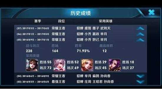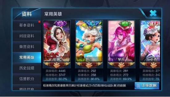 四千多场貂蝉,百分之八十的胜率,随后是妲己、芈月、小乔,胜率都非常高,一看这个常用英雄面板,就知道是个萌妹子无疑,全是漂亮女英雄!