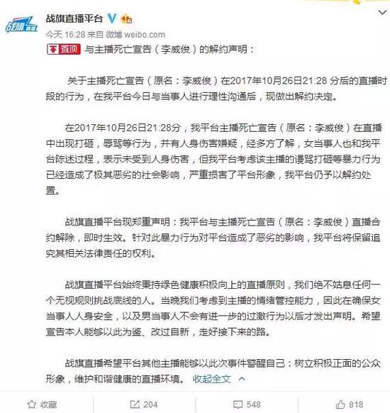 此前将死亡宣告直播间冻结的战旗平台于下午四点发布声明:与当事人进行理性沟通后,做出解约决定。对平台形象所造成的损害,将保留追究其法律责任的权利。