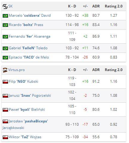 VP在Mirage表现得非常强势,上半场作为CT方打出5-0开局,虽然SK连续得分,但始终没能将比分追平,VP半场结束时取得10-5领先。下半场VP再次赢下手枪局后顺利取得了13-5领先,顽强的SK打出5-0的高潮让他们的分数达到了两位数,但此后他们没能再度得分,VP以16-10先下一城。