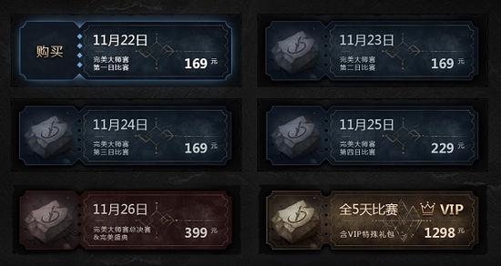 11月7日(明天)上午10时,完美大师赛门票将准时开售。门票将包含主赛事阶段11月22日-26日的单日票,及全五天比赛的VIP通票,VIP通票将赠送超值VIP礼包。11月26日的门票为完美盛典·完美大师赛总决赛通票,在完美盛典过后,就将迎来完美大师赛总决赛,尽享超值体验。本次售票不支持比赛现场购票,请玩家收藏购票页面,于明天10时准时购买门票。