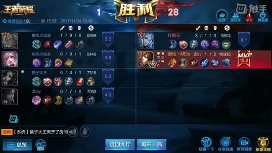 一开始的情况是这样的,2VS4,估计还是怕会输丢人,剑仙祭出了自己的招牌英雄——李白,杜海涛一直法师玩的都很不错,因而选择了诸葛亮。过程就不多说了,简直是一场屠杀。小编想起了Dota时代队友掉线,大神一打五,不过那仿佛都是大后期,队友拿了遗产,而剑仙这一从一开局就是2打4的,只能送上我们的膝盖!战绩图如下: