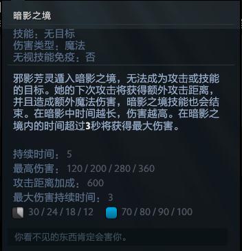 暗影之境将使邪影芳灵进入不可选定状态,并提升邪影芳灵下次普通攻击的攻击距离与伤害。
