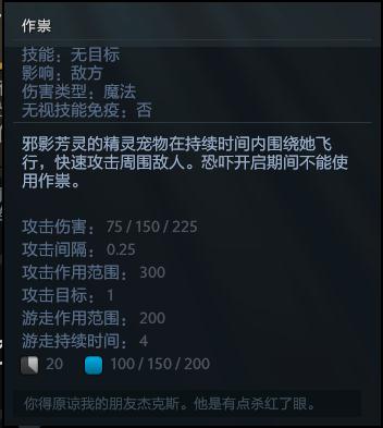 这个技能将对邪影芳灵周围的地方单位造成高额的伤害,但范围较小,而且因为有一个游走范围的存在,使得这个技能很难打满伤害,只有在邪影芳灵与对手保持在100距离以内时,才能打出最高的伤害效果。