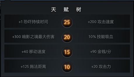 15级天赋的90金钱能给辅助玩家很大帮助,40移动速度则能给邪影芳灵更好的走位能力;20级天赋的300暗影之境最大伤害相比10%的技能吸血实用性稍高;