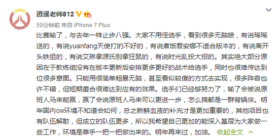 逍遥:比赛输了,与去年一样止步八强。大家不用怪选手,看到很多无脑喷,有说瑶瑶送的,有说yuanfang天使打的不好的,有说煮饭君安娜不适合版本的,有说离开头铁狙的,有说艾琳拿源氏别拿狂鼠的,有说时光乱投大招的。其实绝大部分原因在于教练组没有在版本更新后安排更多更好的战术给选手,同时也很难传达到位很多意图。只能用很简单粗暴无脑,甚至看似较傻的方式去实现,很多阵容也许不错,但短期磨合很难达到应有的效果。选手们已经够努力了,输了会被说原班人马来能赢,赢了会说原班人马来可以更进一步,怎么搞都是一群背锅侠。明年国内ow环境不知道会如何,总之新鲜血液的补充才是更加重要的,其他项目也有队伍解散,但成立的队伍更多,所以我希望自己更加的能深入基层为大家做一些工作,环境是靠手一把一把做出来的。明年再来过,加油。