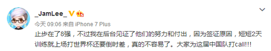 Jamlee:止步在了8强,不过我在后台见证了他们的努力和付出,因为签证原因,短短2天训练就上场打世界杯还要倒时差,真的不容易了。大家为这届中国队打call!!!