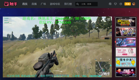 同样,“吃鸡”游戏对电脑配置的要求,让不能随意使用电脑进入游戏的玩家,迫切需要一款有着相似玩法和品质的手游,网易和小米的作品随之出现。而怎么迅速加入这个现象级游戏玩转“吃鸡”,是迫不及待加入其中的玩家朋友们所要了解的内容,对高手玩家的游戏直播和教学视频成为刚需,触手直播炮制其在MOBA类手游《王者荣耀》中的成功,第一时间抢先了优质内容输出渠道,手游吃鸡在触手。