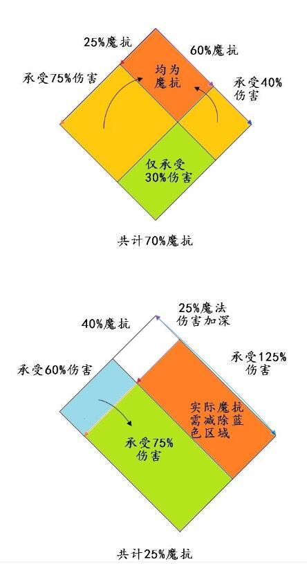 这种“先进行1-计算算出承受伤害,乘法叠加后,再进行1-计算算出实际魔抗”的叠加方式被我称为补数乘法叠加。