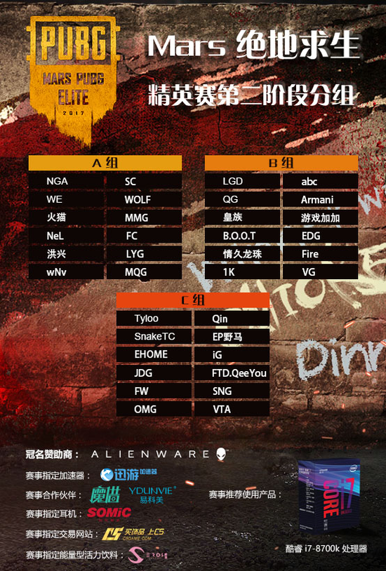 在第一周的激烈选拔过后,由Mars耀宇传媒主办、ALIENWARE冠名赞助、迅游加速器大力支持的Mars绝地求生精英赛本周正式进入36强至总决赛的最终阶段,主办方将通过11月9日周四至11月12日周日四天时间,通过熊猫直播、斗鱼直播、龙珠直播、全民直播、火猫直播、虎牙直播、战旗直播、CC直播、YY、贴吧游戏直播、企鹅电竞、触手总计12个合作直播平台为广大观众呈现本次决赛的精彩直播盛况!