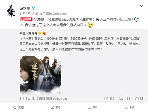 《逆水寒》制作人叶弄舟在微博上表示:在经历大量研究与接纳玩家的反馈意见后,所有的修改内容与修改方向都已确定下来,只需要整个开发组“搬砖”90天,游戏就能够跟玩家见面了”。此消息放出后,《逆水寒》的求码大军重新集结,多“姿势”花样求码的场面又重新上演。