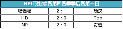 11月11日-11月12日,HPL职业联赛第四赛季季后赛第一周比赛结束,猫猫猫、HD、NP、硬汉四支战队杀出重围,成功晋级第二周的比赛。此外,在这两天的赛程中,还上演了两场精彩的全明星赛:十多名顶尖职业选手随机组成战队,进行了史无前例的大混战。