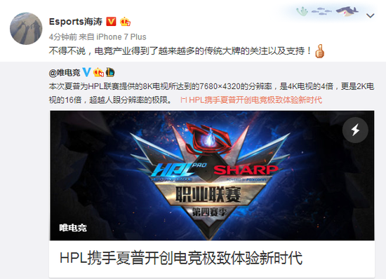 “夏普8k电视,那么厉害的吗?”,“不得不说,电竞产业得到了越来越多的传统大牌的关注以及支持!”……11月2日,一篇关于夏普与移动电竞赛事Hero Pro League(英雄联赛,以下简称HPL)达成合作的新闻引起了电竞圈大V们的注意。