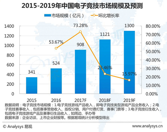 根据Analysys易观于本月初发布的《2017年中国移动电竞赛事商业价值评估分析》显示,2017年中国电竞市场规模比年初预想得还要大,将达908亿元。荷兰市场研究公司Newzoo的一份最新市场报告显示,2017年电子竞技行业的赞助、广告的收入占比达到82%。不过,电竞赛事与传统体育在商业开发上仍有较大差距,2016-17赛季NBA总收入已达80亿美元,其中商业赞助更达6亿美元。