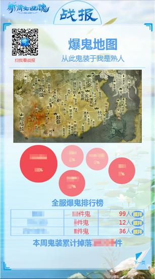 鬼装到底被哪些幸运儿捡走了?“倩女战报”记录了一周内人品最佳的玩家名单,下次在游戏中可要跟紧他们的脚步。为了让你更高效地爆鬼,贴心的战报还为你罗列出了地图上爆鬼率最高的区域,一身鬼紫指日可待!