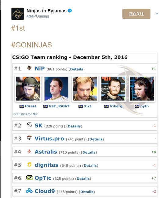 IEM 奥克兰站 2016的举办日期是11月16号到20号,NIP的夺冠成功,也让NIP在12月5号更新的世界排名登顶。