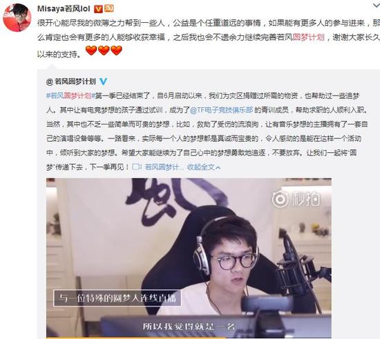 若风在微博上写到:很开心能尽我的微薄之力帮到一些人,公益是个任重道远的事情,如果能有更多人的参与进来,那么肯定也会有更多的人能够收获幸福,之后我也会不遗余力继续完善若风圆梦计划,谢谢大家长久以来的支持。