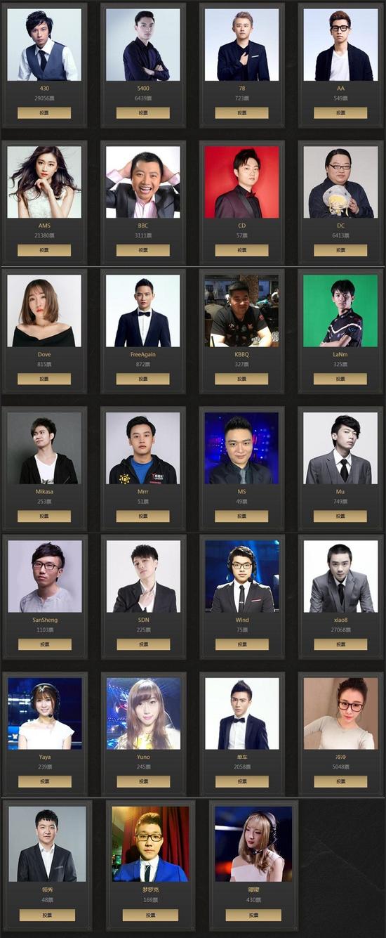 包括了430、5400、78、AA、AMS、BBC、CD、DC、Dove、FreeAgain、KBBQ、LaNm、Mikasa、Mrrr、MS、Mu、SanSheng、SDN、Wind、xiao8、Yaya、Yuno、单车、冷冷、领秀、梦罗克和嘤嘤在内的解说名单中,你更愿意将票投给谁呢?