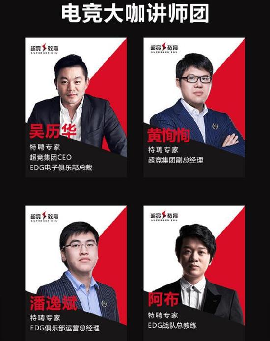 早在2017年6月的“与时·聚竞”年度品牌发布会上,腾讯电竞就宣布与超竞教育集团、中国传媒大学、麻省理工学院就电竞专业展开合作。时隔5个月,招生计划正式开启,除超竞集团副总经理黄恂恂先生宣布成为讲师团特聘专家外,知名游戏战队EDG电子竞技俱乐部也参与其中,超竞集团CEO、EDG俱乐部总裁吴历华先生、EDG俱乐部运营总经理潘逸斌先生、EDG战队总教练阿布都已宣布入驻超竞教育,成为讲师团的一员。强大的讲师阵容揭示着超竞教育对电竞专业领域的重视和规范化,力图成为行业内的第一标杆。
