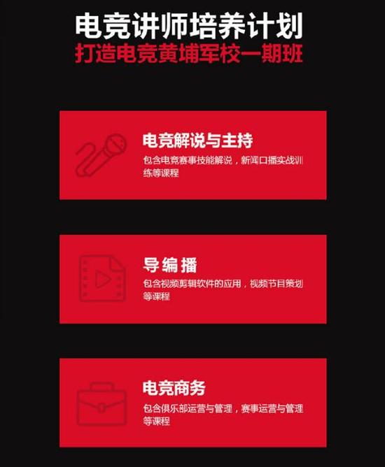 超竞教育“电竞讲师培养计划”,旨在打造电竞专业向的黄埔军校,一期班将重点培养三大科目——电竞解说与主持、导编播和电竞商务。电竞解说与主持,包含电竞赛事技能解说、新闻口播实战训练等课程。导编播,包含视频剪辑软件应用、视频节目策划等课程。电竞商务,包含俱乐部运营与管理,赛事运营与管理等课程。
