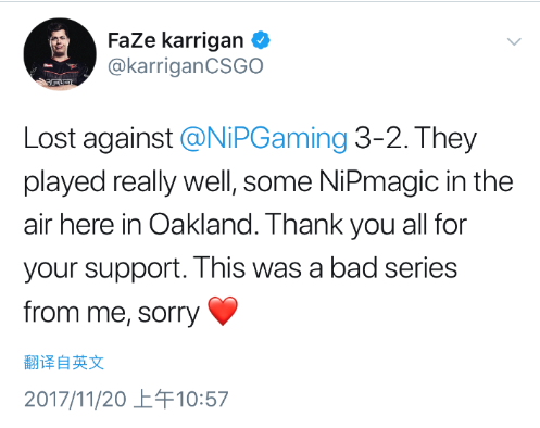 karrigan:我们3-2输给了NiP。他们表现的十分出色,可能奥克兰真的有信仰加成吧。感谢所有支持我们的人。这场系列赛我的发挥不好,抱歉。