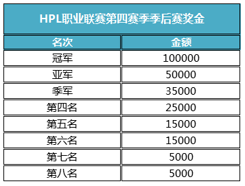 除了象征最高荣誉的冠军奖杯,HPL职业联赛第四赛季季后赛共设立250000元人民币奖金,其中本次季后赛冠军将独得其中100000元。