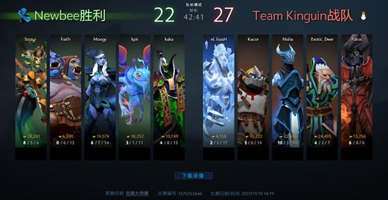 Newbee对阵Kinguin,在前期打出了不小的优势,然而在寒冬飞龙的大招下,Newbee几次进攻都被打退,最终,Kinguin完成逆转,先取一分。第二局Newbee选出卓尔游侠美杜莎体系,在前中期被Kinguin的冲脸压制,然而在后期,逐渐成型的Newbee在团战中渐渐扳回局面,成型的美杜莎发挥出巨大作用,Newbee艰难扳平比分。