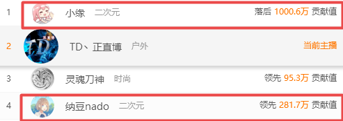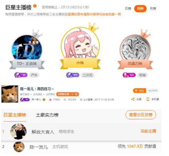 而陈一发与小缘的对决中,发姐粉丝数量大家都知道的,都是中产忠实粉丝,就不多说了。据说当天陈一发直播到凌晨三点,24号当晚让粉丝们“自习”,小缘那里一天能倾倒三四百万荣耀值,这下反差起来了?还是不要轻视发姐粉丝的力量吧。