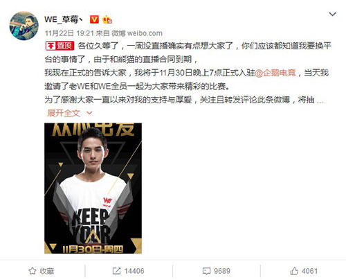 近日,草莓和熊猫的直播约到期,关于他的去留问题也引发众人关注,已经有一周没有直播的他刚刚通过个人微博透露,决定转战企鹅电竞并于11月30日晚重新开启自己的直播。