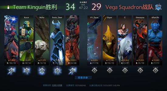 第三局的Kinguin从对线期起就取得了优势,剃刀和小小双核经济持续积累。然而混沌骑士的战斗力为Vega提供了逆转的机会,两队在中期也渐渐焦灼。在肉山团战中,Vega成功夺取了不朽之守护,然而后期小小的战斗力为Kinguin提供了足够的支持,Kinguin成功推平Vega高地,也将进入胜者组半决赛。