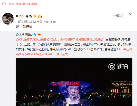 然而论起疯狂和行动力,任何人都比不上战队的铁杆粉丝,XQ战队阿泰的粉丝,更以其数量庞大忠心耿耿而闻名于圈内外。昨天,猪苗们(阿泰粉丝的昵称)再次为他们的爱豆搞了个大新闻——承包了世博园中国馆前的上海碗,轮流播放应援视频,为阿泰疯狂打call!