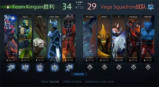 第三局的Kinguin从对线期起就取得了优势,剃刀和小小双核经济持续积累。然而混沌骑士的战斗力为Vega提供了逆转的机会,两队在中期也渐渐焦灼。在肉山团战中,Vega成功夺取了不朽之守护,然而后期小小的战斗力为Kinguin提供了足够的支持,Kinguin成功推平Vega高地,也将进入胜者组半决赛。