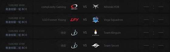 compLexity Gaming将在败者组首轮对阵Mineski.YDB,LGD.Forever Young则要等待Vega Squadron的挑战,而Team Kinguin和Team Secret等待着之前两组对决的胜者。