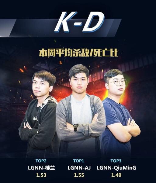 再看K-D比(平均杀敌/死亡比),不仅要赞叹一声,厉害了我的LGNN!三名队员AJ、楼兰和QiuMinG来了一次小小的屠榜,可见这支队伍超强的个人能力。这支战队来自深圳,深圳的玩家们准备好在总决赛给他们疯狂打call了吗?
