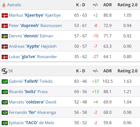 下半场换边后,SK连拿4分,双方战成10-10平。A队率先拿到赛点,但SK凭借FalleN出色的发挥,顽强的将比赛拖入加时。在加时赛当中,SK最终以19-16的比分锁定胜局。